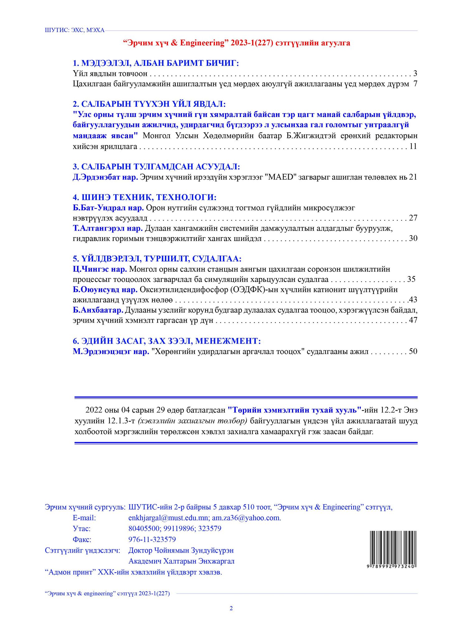 “Эрчим хүч & Engineering” 2023-1(227) сэтгүүлийн агуулга