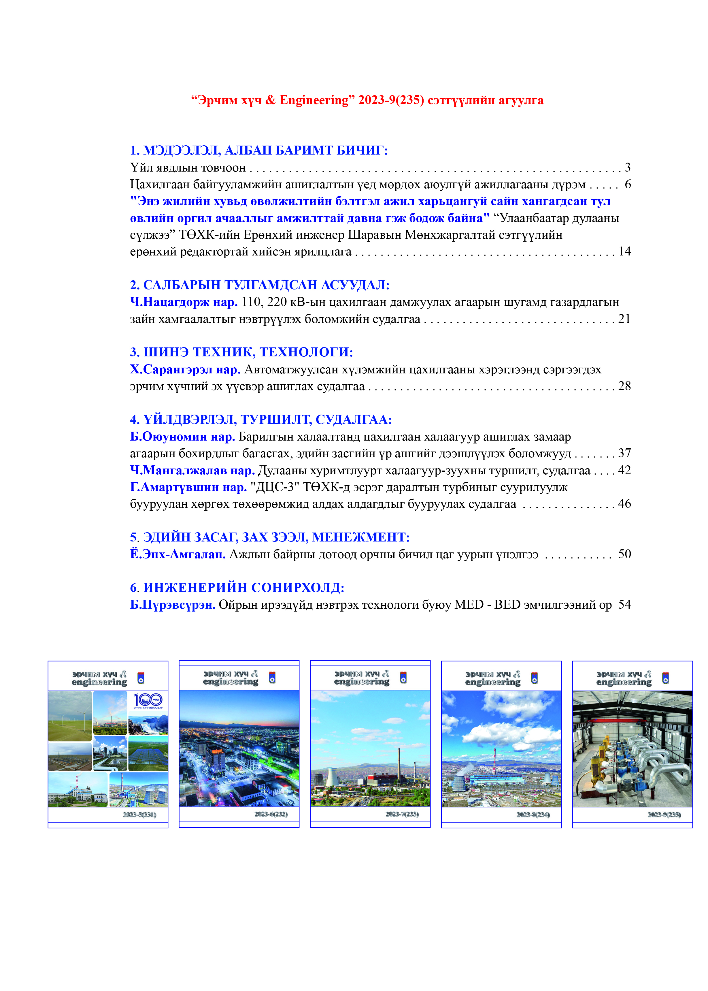 “Эрчим хүч & Engineering” 2023-9(235) сэтгүүлийн агуулга